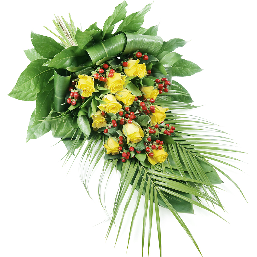 Introducing our Heaven's Light Spray arrangement, a masterful blend of nature's colors and heartfelt sentiment. This bespoke bouquet features a beautiful composition of sunny yellow roses and distinct red hypericum, expertly arranged to express profound reverence and care. Each flower is hand-selected for its optimal freshness and vibrant hues, ensuring an arrangement that is both luxurious and enduring.