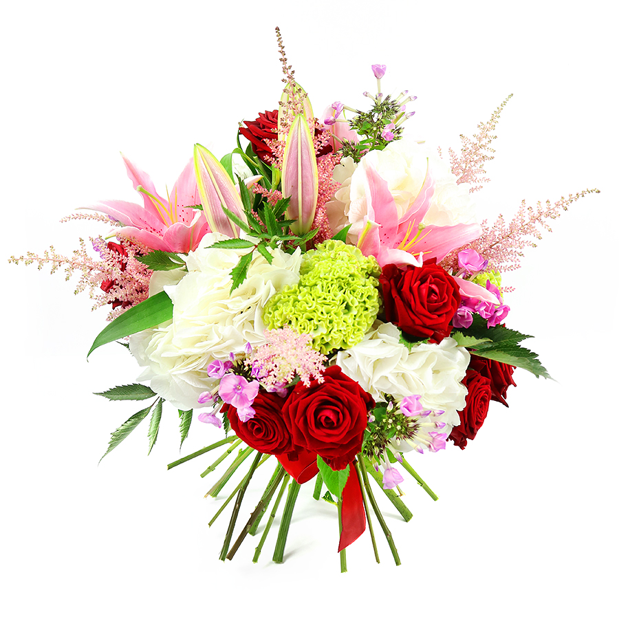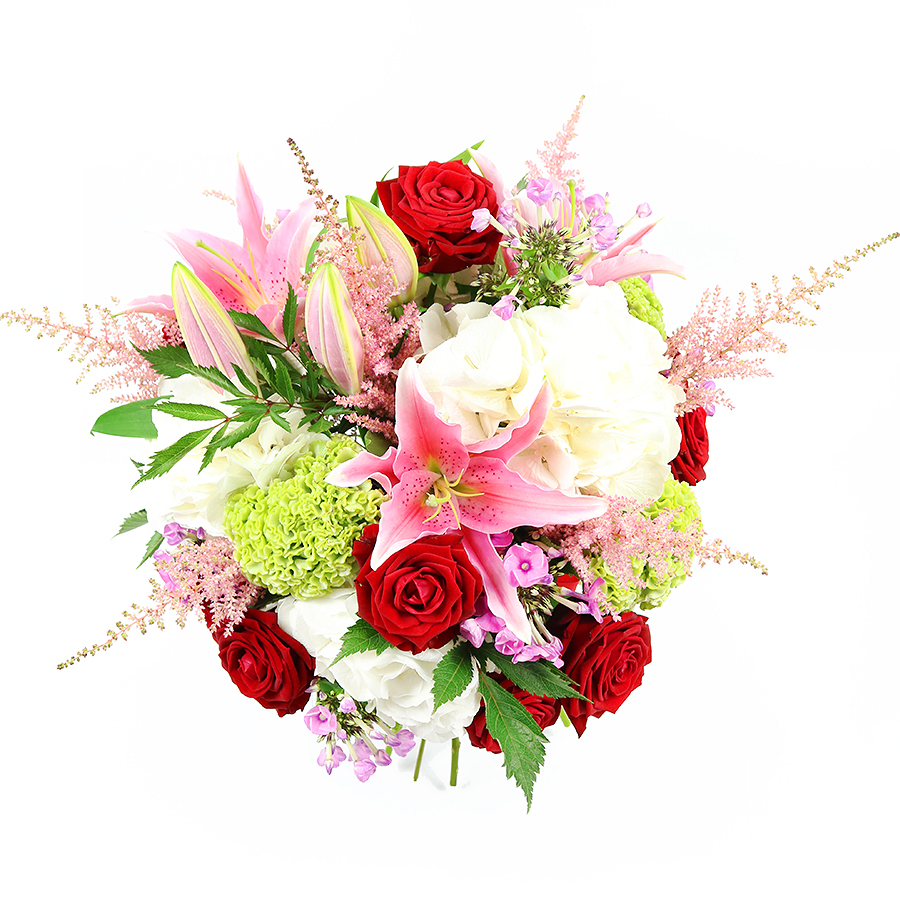 Share your heartfelt sentiments with our Blossoming Love Arrangement. This captivating bouquet features a harmonious blend of red roses, white hydrangea, pink lilies, pink astilbe, and green celosia, accented by lovely phlox. Perfect for saying "Thinking of You" or "I Love You".