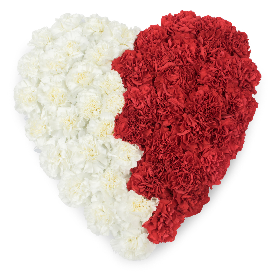 Presenting our beautifully unique heart-shaped bouquet, featuring a vibrant mix of white and red carnations. Each flower is hand-picked to ensure maximum freshness and quality.